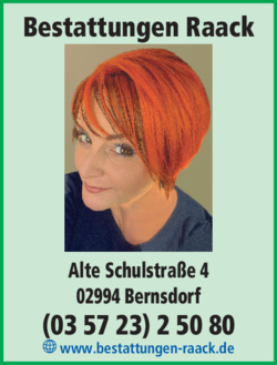 Bei Bestattungen Raack sind Sie in guten Händen, wenn Sie in den schweren Momenten Ihres Lebens ein zuverlässiges Bestattungsunternehmen in Bernsdorf suchen. Babett Raack-Rösler und ihr Team bieten eine individuelle Trauerbegleitung an und helfen Ihnen gerne bei der Erledigung aller Formalitäten, von der Besorgung der Sterbeunterlagen bis hin zur Überführung des Verstorbenen. Auch bei der Terminabsprache mit dem Friedhofsamt und dem Trauerredner sowie bei der Gestaltung von Traueranzeigen oder Trauerdrucksachen helfen Ihnen die erfahrenen Bestatter vor Ort gerne weiter. Das Beerdigungsinstitut bietet verschiedene Bestattungsarten an. Hierzu gehören neben Erdbestattung und Feuerbestattung auch die Seebestattung sowie die Baumbestattung im Bestattungswald Kamenz. Darüber hinaus sind auf Anfrage auch anonyme Bestattungen möglich.