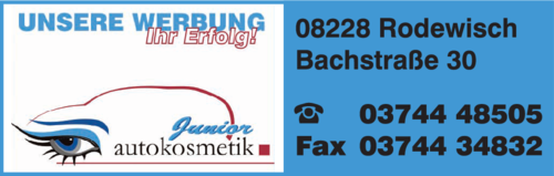 Sie sind auf der Suche nach Junior Autokosmetik in Rodewisch? Das Telefonbuch hilft weiter: Dort finden Sie Angaben wie die Adresse und die Öffnungszeiten. Um zu Junior Autokosmetik zu kommen, können Sie einfach den praktischen Routenplaner nutzen: Er zeigt Ihnen nicht nur die schnellste Anfahrtsstrecke, sondern mit der Funktion "Bahn/Bus" können Sie sich die beste Verbindung mit den öffentlichen Verkehrsmitteln zu Junior Autokosmetik in Rodewisch anzeigen lassen. Schauen Sie am besten gleich nach Verbindungen innerhalb der Öffnungszeiten. Übrigens: Sie können die Adresse auch als VCF-Datei für Ihr digitales Adressbuch speichern, so dass Sie diese gleich parat haben für Ihren nächsten Besuch bei Junior Autokosmetik in Rodewisch. Und Sie können diese sogar per Mail oder SMS an Ihre Freunde oder Ihre Bekannten versenden, wenn Sie Junior Autokosmetik weiterempfehlen möchten.