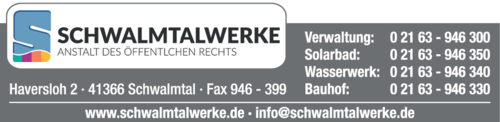 Sie suchen Schwalmtalwerke AöR in Waldniel? Die vollständige Adresse sehen Sie mit eventuellen Öffnungszeiten hier auf dieser Seite. Sie brauchen diese Adresse häufiger? Dann speichern Sie sich doch Schwalmtalwerke AöR aus Schwalmtal-Waldniel direkt als VCF-Datei für Ihr digitales Adressbuch mit allen Kontaktdaten. Ganz praktisch sind übrigens die kostenfreien Routen-Services für Schwalmtal: Lassen Sie sich die Adresse von Schwalmtalwerke AöR auf der Karte von Schwalmtal unter "Kartenansicht" anzeigen - inklusive Routenplaner. Hier können Sie sich mit der Funktion "Bahn/Bus" auch gleich die beste öffentliche Verbindung zu Schwalmtalwerke AöR in Schwalmtal während der jeweiligen Öffnungszeiten anzeigen lassen. So können Sie gut planen, wie lange Sie zu Schwalmtalwerke AöR brauchen und wann Sie sich auf den Weg machen sollten.