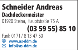 Wenn Sie Schneider Andreas Dachdeckermeister in Steina anrufen möchten, erreichen Sie Ihren Ansprechpartner unter der Telefonnummer 035955 85 10 zu den jeweiligen Öffnungszeiten. Um zu Schneider Andreas Dachdeckermeister in Steina zu gelangen, nutzen Sie am besten die kostenfreien Routen-Services: Diese zeigen Ihnen die Adresse von Schneider Andreas Dachdeckermeister auf der Karte von Steina unter "Kartenansicht" an und erleichtern Ihnen dank des Routenplaners die Anfahrt. Ganz praktisch ist hierbei die Funktion "Bahn/Bus", die Ihnen die beste öffentliche Verbindung zu Schneider Andreas Dachdeckermeister in Steina während der Öffnungszeiten anzeigt. Sie sind häufiger dort? Dann speichern Sie sich doch die Adresse gleich als VCF-Datei für Ihr digitales Adressbuch oder versenden Sie die Kontaktdaten an Bekannte, wenn Sie Schneider Andreas Dachdeckermeister weiterempfehlen möchten.