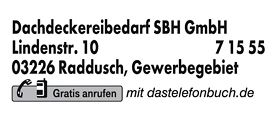 Dachdeckereibedarf SBH GmbH in Raddusch-Raddusch erreichen Sie unter der Telefonnummer 035433 7 15 55. Während der Öffnungszeiten hilft man Ihnen dort gerne weiter. Sie möchten Dachdeckereibedarf SBH GmbH an Bekannte oder Freunde weiterempfehlen? Sie können die Kontaktdaten einfach per Mail oder SMS versenden und auch als VCF-Datei für Ihr eigenes digitales Adressbuch speichern. Für Ihren Besuch bei Dachdeckereibedarf SBH GmbH nutzen Sie am besten die kostenfreien Routen-Services für Raddusch: Lassen Sie sich die Adresse von Dachdeckereibedarf SBH GmbH auf der Karte von Raddusch unter "Kartenansicht" inklusive Routenplaner anzeigen oder suchen Sie mit der praktischen Funktion "Bahn/Bus" die beste öffentliche Verbindung zu Dachdeckereibedarf SBH GmbH in Raddusch.